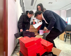 “Mr Li Yixin, Advisory Board Member of Dalang Charity Foundation, Mr Zhao Shiyang, Chairman of the Board of Directors, and Mr Yang Ping, Vice Chairman of the Board of Directors, distributed gifts and red packets to the representatives of the family members of the employees.