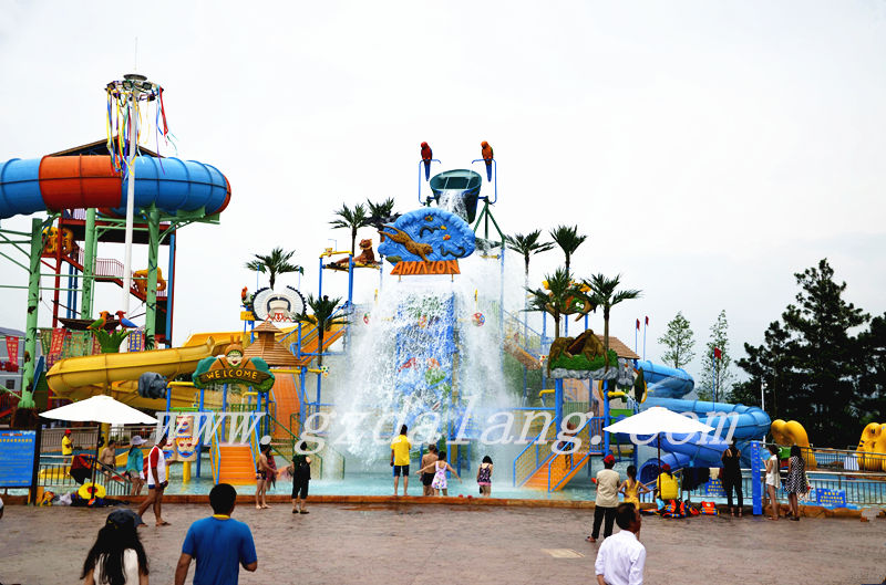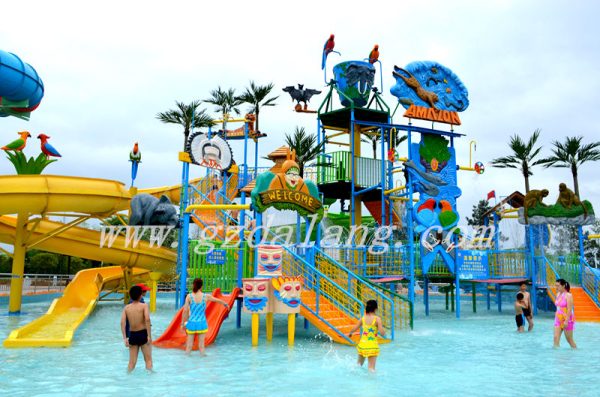 Amazon Water House is designed with the tropical rain forest style. It consists of all kinds of shapes of water slides and colorful water activity condensed in this colorful “Castle”