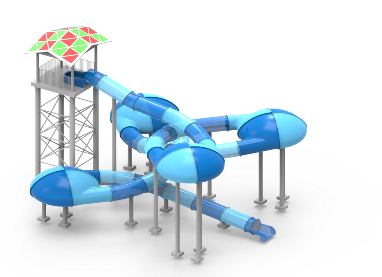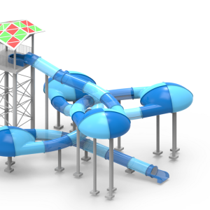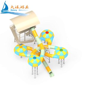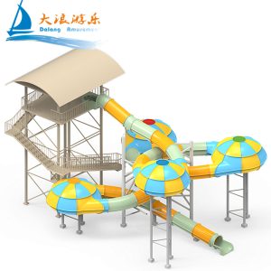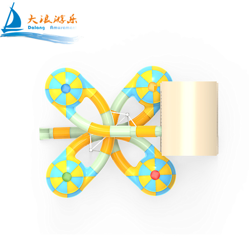 The Water Disco Slide consists of an enclosed raft slide connecting four flying saucers. The slide section can be designed with a colorful rainbow ring light effect according to client requirements, which not only enhances the entertainment value but also allows natural light from the outside to provide illumination.