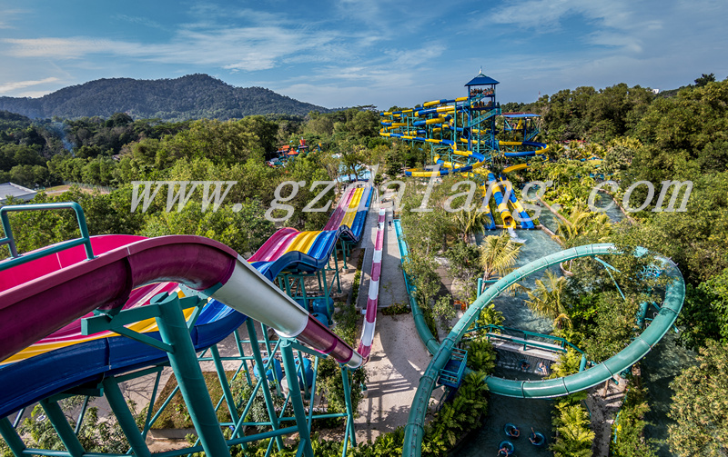 The Multi-lane rainbow water slide is equipped with multiple slides. This design allows multiple visitors to slide at the same time, which not only enhances the fun of sliding, but also increases the throughput of the amusement facilities and reduces the waiting time in line.